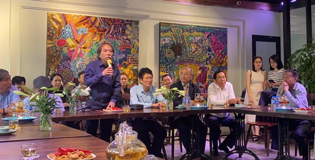 Ông Phan Đức Nhạn (trái) phát biểu tại buổi giới thiệu sách.