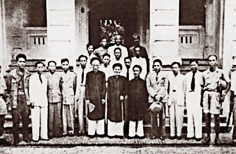 Chủ tịch Hồ Chí Minh và cụ Huỳnh Thúc Kháng (hàng đầu, thứ nhất từ phải sang) trong Chính phủ đầu tiên của nước Việt Nam dân chủ cộng hòa. Ảnh tư liệu.