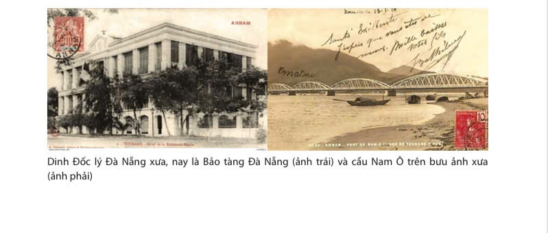 Dinh Đốc lý Đà Nẵng xưa, nay là Bảo tàng Đà Nẵng (ảnh trái) và cầu Nam Ô trên bưu ảnh xưa (ảnh phải)