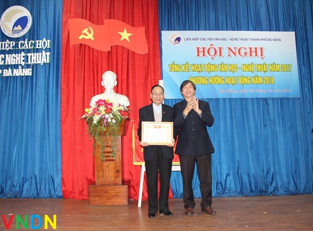Ông Bùi Xuân - Phó Ban Tuyên giáo Thành ủy Đà Nẵng trao cờ thi đua của Liên hiệp các Hội Văn học - Nghệ thuật Việt Nam cho Liên hiệp các Hội Văn học - Nghệ thuật Đà Nẵng về thành tích hoàn thành xuất sắc nhiệm vụ năm 2017.