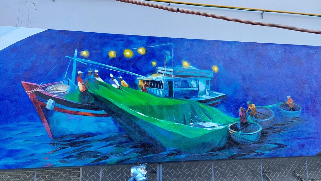 Công việc của ngư dân làng chài được tái hiện sinh động trên những bức bích họa.