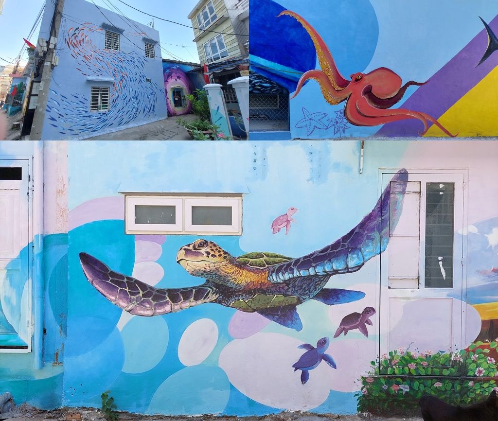 Đó là cảnh các ngư dân cùng kéo lưới, đánh bắt hải sản; cảnh những người thợ làm thuyền, trẻ em, người già, phụ nữ trông ngóng những người đàn ông trở về… Những bức bích họa cũng mô tả môi trường sống ở đại dương với các loài hải sản như: đàn cá nục nhỏ, bạch tuộc, cá ông, cá chuồn bay…