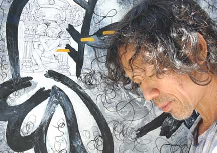 Họa sĩ Phan Ngọc Minh trầm ngâm trước tác phẩm ''Tự Họa với Shiva'' (Ảnh : Lê Hải)