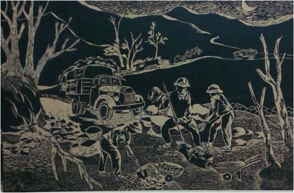Tác phẩm Đêm trường sơn của tác giả Trần Hữu Cân, khắc gỗ