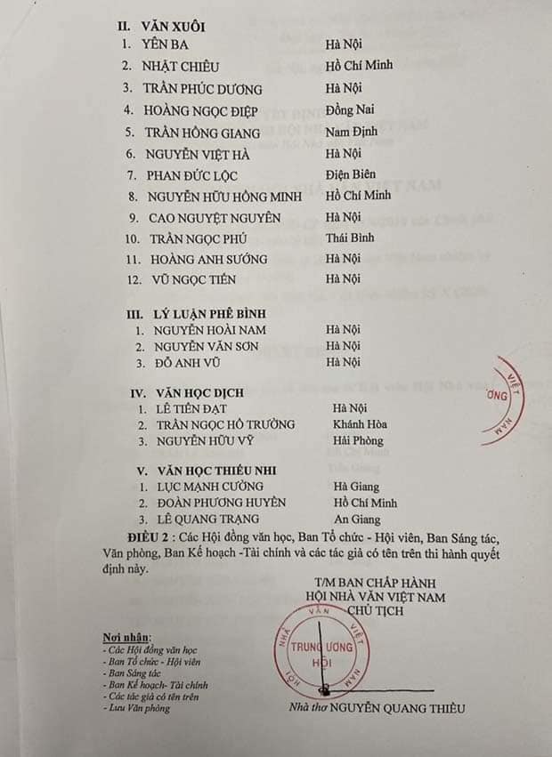 Theo thông tin từ Văn phòng Hội Nhà văn Việt Nam, Chủ tịch Hội Nhà văn Việt Nam Nguyễn Quang Thiều vừa ký quyết định số 12/QĐ-HNV ngày 04.1.2022 về việc "Kết nặp hội viện Hội Nhà văn Việt Nam". Năm nay có 36 tác giả được kết nạp vào Hội thuộc các lĩnh vực thơ, văn xuôi, nghiên cứu phê bình, văn học dịch, văn học thiếu nhi.