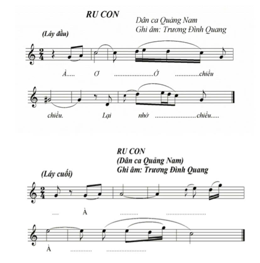 Xứ Quảng, vùng đất Nam Trung Bộ có những cánh đồng bạt ngàn cây xanh, những bãi biển chạy dài với hàng dừa xa tít, nơi sản sinh nhiều làn điệu ru con. Với các bài hát ru, chức năng dỗ ngủ được cảm nhận ngay từ câu “à…ơi...” của nét nhạc mở đầu. Ở mỗi vùng, mỗi dân tộc, các bà mẹ đã sử dụng những đường nét luyến láy riêng để đưa hơi cho câu hát ru của mình. Một làn điệu ru con rất quen thuộc của người dân xứ Quảng có láy đầu và láy cuối rất đặc trưng.