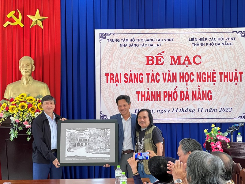 NNC Bùi Văn Tiếng - Chủ tịch Liên hiệp các Hội Văn học - Nghệ thuật thành phố Đà Nẵng trao tặng bức tranh "Nhà sáng tác Đà Lạt" (bút sắt) của họa sĩ Lê Huy Hạnh cho Nhà sáng tác Đà Lạt.