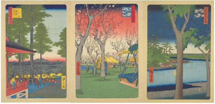 Trong bức tranh trên (hay bất cứ bức nào khác lấy đề tài về thiên nhiên), phần phong cảnh được thể hiện vô cùng tỉ mỉ, con người trong tương quan với thiên nhiên hoặc nhỏ nhoi, hoặc “ngang bằng”, tức không bao giờ chiếm vị thế lớn hơn trong nội dung bức tranh. Và dù nhỏ bé hay ngang bằng, con người gần như tan loãng, trở thành một phần tuy phải nhìn kĩ mới thấy (như bức tranh trên), nhưng lại không thể thiếu để tạo nên một tổng thể hài hòa, uyển chuyển. Tranh của Hiroshige cũng vậy. Ông được biết tới với những bộ Ukiyo-e về phong cảnh, ghi lại vô vàn cảnh sắc khác nhau của Edo như: Năm mươi ba trạm dừng tuyến Tokaido, Sáu mươi chín trạm dừng Kisokaido, Ba mươi sáu cảnh sắc núi Phú Sĩ, Sáu mươi thắng cảnh tỉnh lẻ, Một trăm thắng cảnh Edo, Phong cảnh Edo, Phong cảnh Omi, Phong cảnh Kanazawa… Xuyên suốt những bộ tranh kể trên là diễn cảnh thiên nhiên và con người Edo trọn cả bốn mùa xuân, hạ, thu, đông. Trong bộ tranh nổi tiếng Một trăm thắng cảnh Edo, có thể chia các tác phẩm thành bốn phần tương ứng với bốn mùa trong năm, cụ thể: Mùa xuân (bức 1 – 42), Mùa hạ (bức 43 – 72), Mùa thu (bức 73 – 98), và Mùa đông (bức 99 – 118). “Công thức” đặt tên cho các bức tranh thường là “địa điểm” cộng “quý ngữ” (từ chỉ mùa), hoặc có thể đơn giản chỉ là “địa điểm” được nhắc tới, còn “quí ngữ” sẽ biểu hiện ngay trong tranh bằng những sự vật, hiện tượng tiêu biểu cho mỗi mùa của Nhật Bản. Điều này không chỉ xuất hiện ở mỗi Hiroshige mà gần như phổ biến khắp giới họa sĩ tranh khắc gỗ.