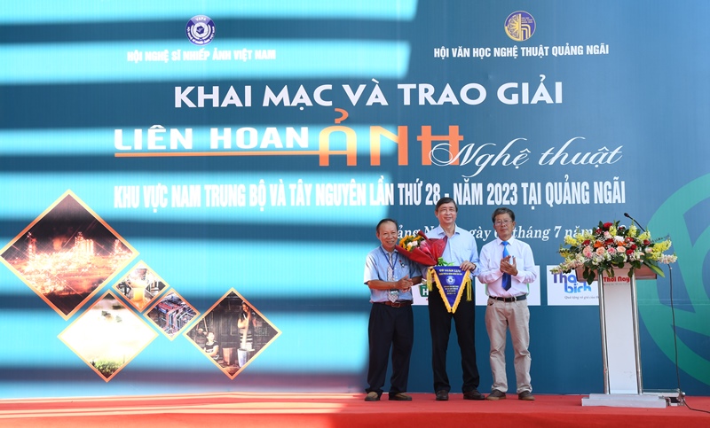 Ban tổ chức trao cờ cho Nhà Nghiên cứu Bùi Văn Tiếng - Chủ tịch Liên hiệp các Hội Văn học - Nghệ thuật thành phố Đà Nẵng - Đại diện đơn vị sẽ đăng cai Liên hoan ảnh nghệ thuật khu vực Nam Trung bộ và Tây nguyên lần thứ 29 năm 2024.