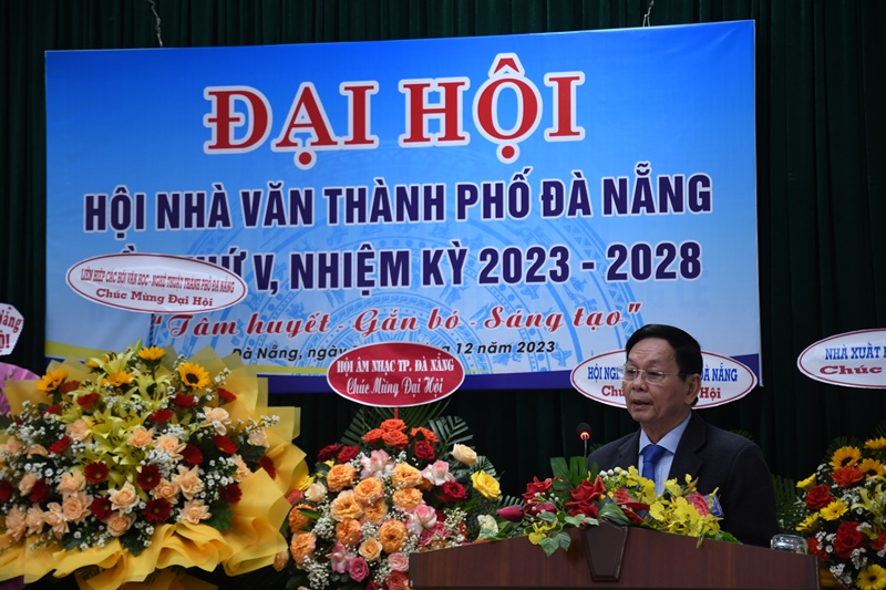 Nhà nghiên cứu Bùi Văn Tiếng - Bí thư Đảng đoàn, Chủ tịch Liên hiệp các Hội Văn học - Nghệ thuật phát biểu khẳng định và biểu dương những đóng góp tích cực của Hội Nhà văn thành phố trong nhiệm kỳ qua. Trong nhiệm kỳ 2023-2028, Ban Chấp hành mới cần thực sự đứng mũi chịu sào hướng về đại cuộc theo tinh thần tâm huyết, gắn bó, sáng tạo cùng nhau đoàn kết tổ chức thực hiện tốt nhất Nghị quyết của Đại hội nhiệm kỳ 2023-2028. Mỗi hội viên cần phát huy cao nhất năng lực sáng tạo nghệ thuật, vừa phục vụ nhiệm vụ chính trị của địa phương với tư cách những công-dân-nghệ-sĩ, vừa phục vụ cho sự phát triển của bản thân nghệ thuật ngôn từ, góp phần xứng đáng vào việc gầy dựng thương hiệu Đà Nẵng luôn trân trọng với văn chương.