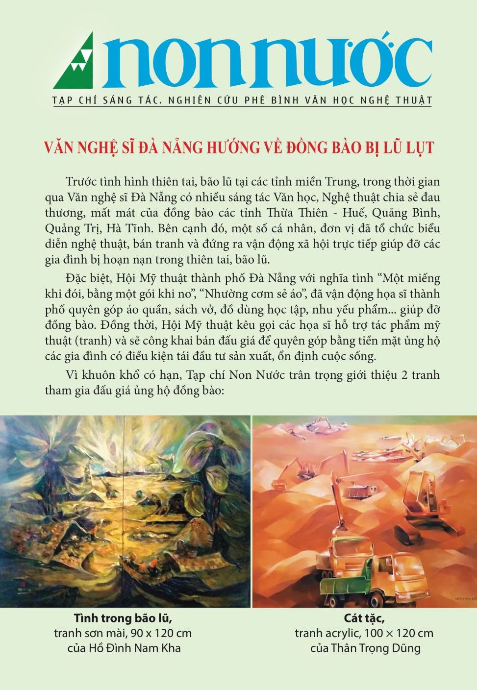 Bìa 4: Chúng tôi dành đăng thông tin Hội Mỹ thuật thành phố Đà Nẵng tổ chức vận động quyên góp và hỗ trợ tranh bán đấu giá ủng hộ đồng bào lũ lụt Miền Trung và giới thiệu một số tranh chuẩn bị đấu giả của các họa sĩ Đà Nẵng.