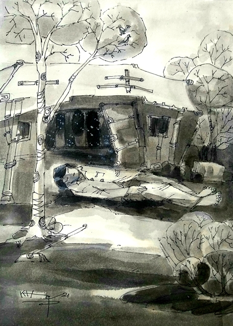 Nàng quay lại nhìn về phía tôi. Môi hơi mím, ngân vài tiếng ấm ứ trong cổ họng. Nghe như tiếng một con ma hát giữa cánh đồng đêm.