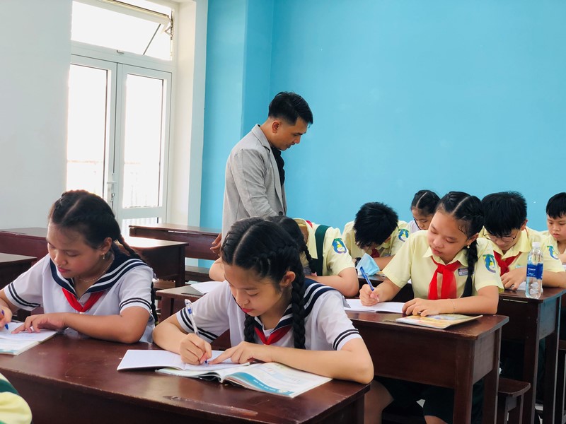 Nhạc sĩ Cao Tâm (giữa) và các em học sinh trường Trung học cơ sở Trưng Vương