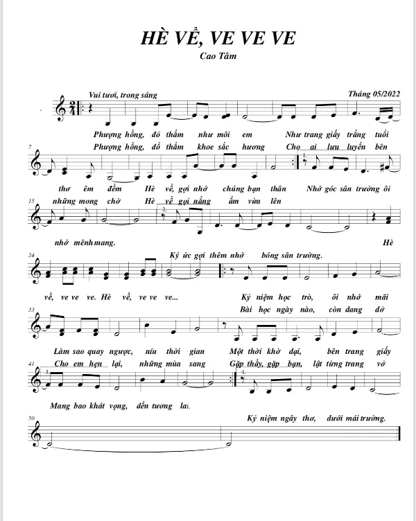 Ở đoạn điệp khúc “Hè về ve ve ve…”, nhạc sĩ Cao Tâm tài tình sử dụng lối hát đuổi nên càng làm câu nhạc quấn quýt liền lạc như tâm tư tác giả trào dâng với cảm xúc chứa chan tình cảm yêu thương dành cho học trò.