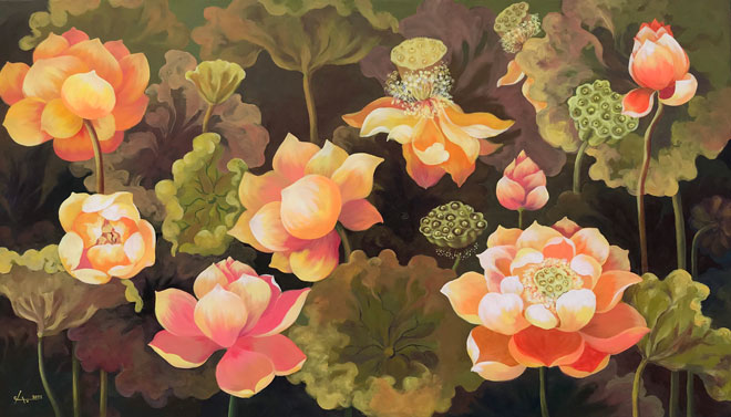 Tác phẩm "Sen hạ" với lối sử dụng màu tinh tế, sang trọng của họa sĩ trẻ Nguyễn Thị Đào. |