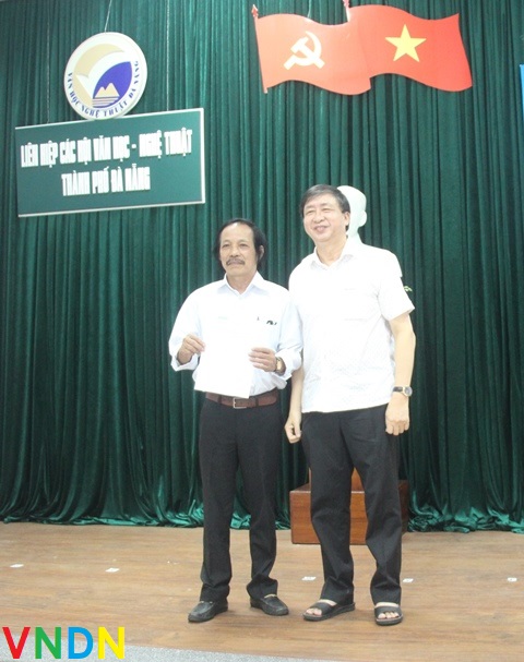 NNC Bùi Văn Tiếng - Chủ tịch Liên hiệp Hội trao giấy phép thiết lập Trang thông tin điện tử tổng hợp Văn nghệ Đà Nẵng cho Nhà thơ Nguyễn Nho Khiêm - Phụ trách Trang thông tin điện tử tổng hợp Văn nghệ Đà Nẵng.