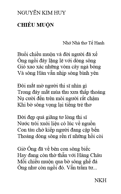Những năm cuối đời, khi Nhà thơ Tế Hanh lâm trọng bệnh phải nằm một chỗ rất nhiều năm tại căn gác nhỏ số 10 Nguyễn Thượng Hiền Hà Nội trong sự chăm lo tận tình của Cụ bà, mỗi khi có dịp đi Hà Nội, tôi vẫn luôn đến thăm Nhà thơ. Lần cuối, trong một dịp Đại hội Nhà văn Việt Nam, tôi cùng nhà thơ Thanh Quế và nhà văn Nguyễn Tam Mỹ tranh thủ lúc nghỉ chạy đến thăm ông... Nhà thơ nằm đó, trên chiếc giường nhỏ, lặng lẽ, rất lặng lẽ đối diện cùng cõi hư vô… Chúng tôi cùng đứng im, lặng lẽ nhìn, lặng lẽ tiễn biệt một tâm hồn thi ca đích thực đang trở về với con sông quê hương…