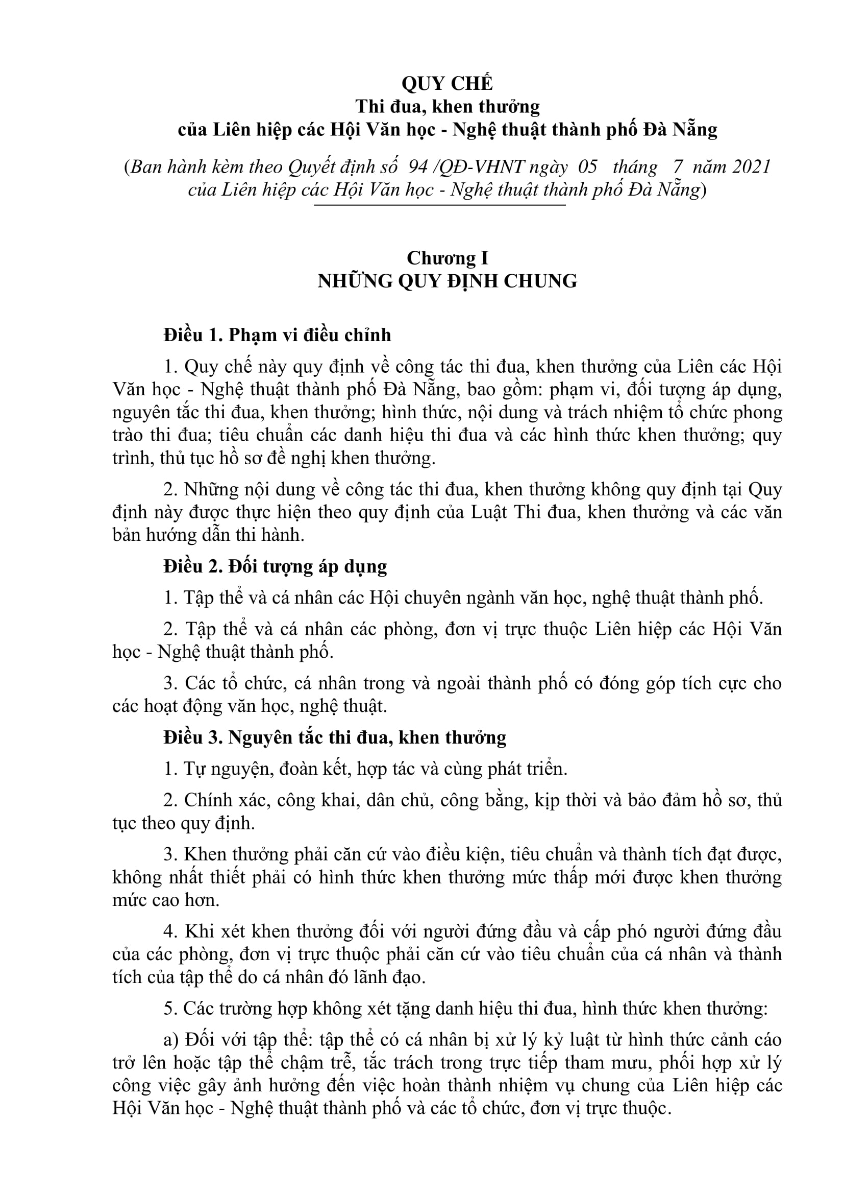 Quy chế được ban hành kèm theo Quyết định số 94 /QĐ-VHNT ngày 05 tháng 7 năm 2021 của Liên hiệp các Hội Văn học - Nghệ thuật thành phố Đà Nẵng