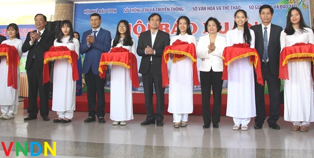 Các đồng chí lãnh đạo thành phố cắt băng khai mạc Hội báo Xuân Mậu Tuất 2018.