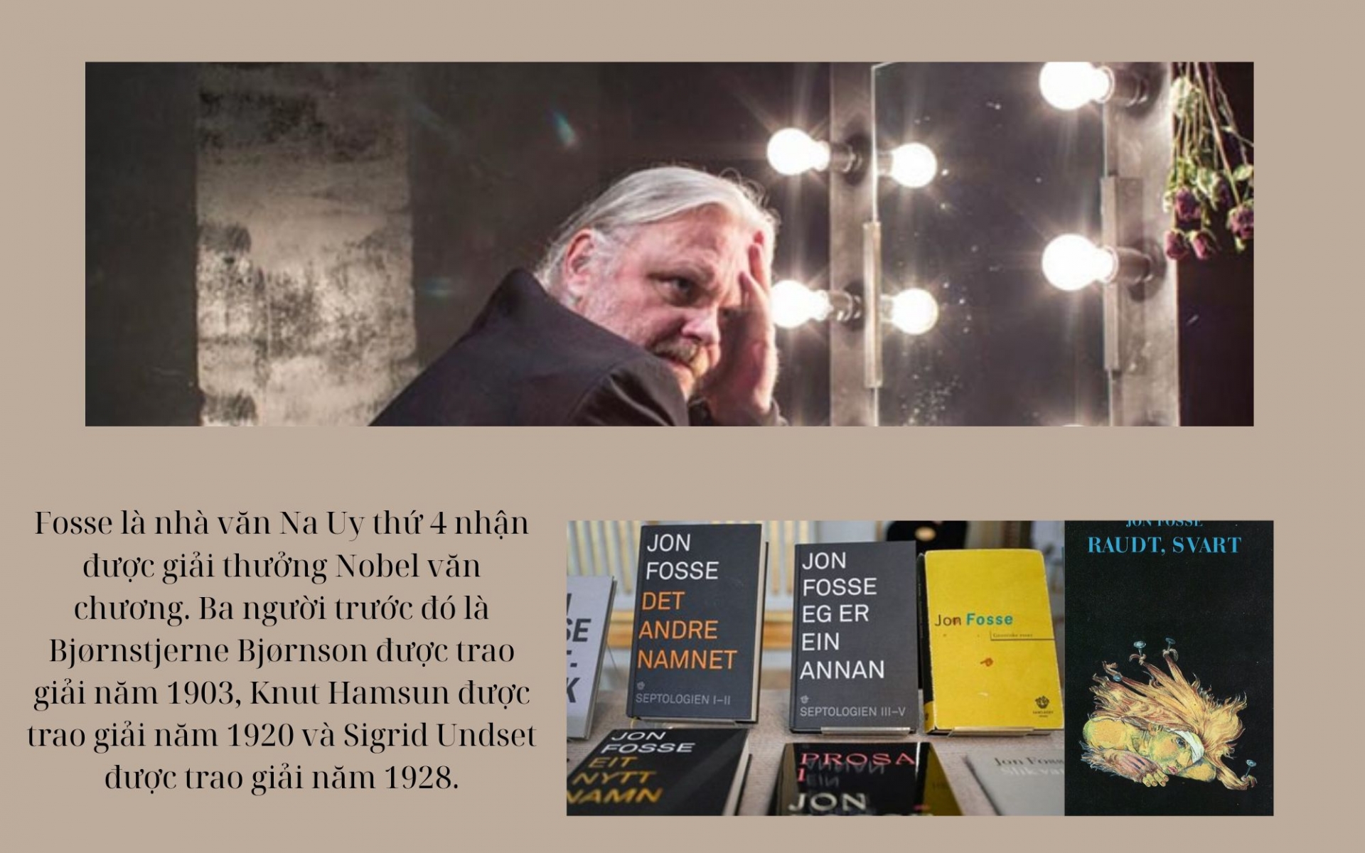 Nhà văn người Na Uy Jon Fosse (64 tuổi) đã trở thành chủ nhân của giải Nobel Văn học 2023 vì "những vở kịch và tác phẩm sáng tạo của ông đã ...