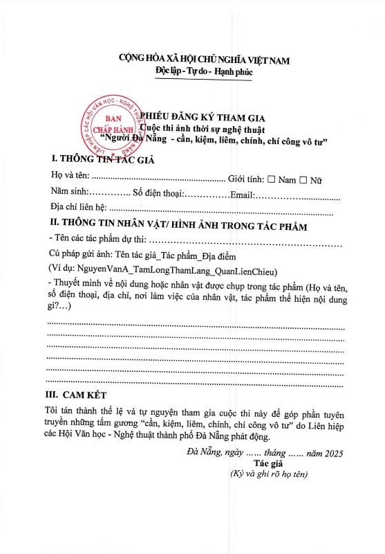 Cuộc thi thời sự nghệ thuật “Người Đà Nẵng - Cần, kiệm, liêm, chính, chí công vô tư” do Liên hiệp các Hội Văn học - Nghệ thuật thành phố Đà Nẵng đã chính thức phát động từ ngày 16/5/2025. Qua hơn 4 tháng phát động, cuộc thi đã nhận được sự hưởng ứng tham gia của những người yêu nghệ thuật nhiếp ảnh trên toàn thành phố.