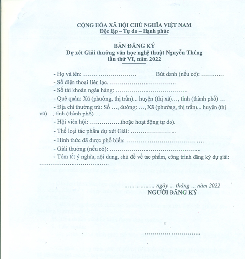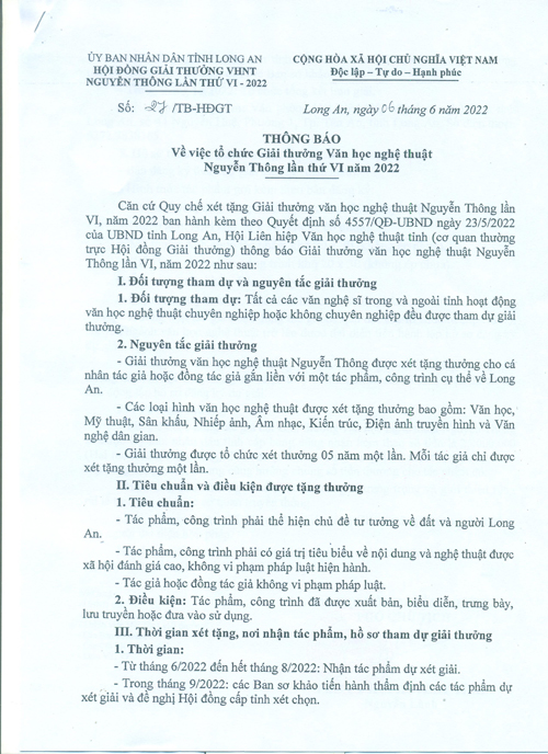 Thông báo tổ chức Giải thưởng VHNT Nguyễn Thông lần thứ VI, năm 2022