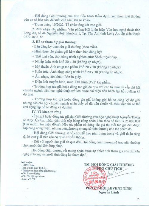 Hội đồng Giải thưởng Nguyễn Thông lần thứ VI, năm 2022 Thông báo Tổ chức Giải thưởng: