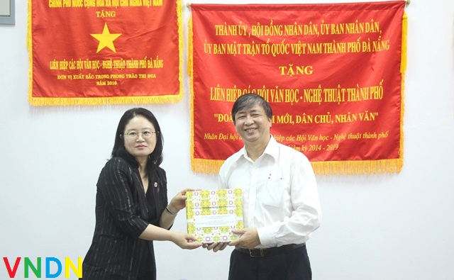 Đại diện lãnh đạo Liên hiệp các Hội Văn học - Nghệ thuật Đà Nẵng và Đoàn Đại biểu Văn phòng đại diện thành phố Daegu (Hàn Quốc) tại thành phố Hồ Chí Minh đã tặng quà lưu niệm cho ghi nhận buổi gặp mặt và làm việc.