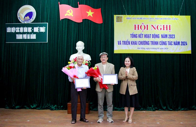 Nhà nghiên cứu Đinh Thị Trang - Chủ tịch Hội Văn nghệ dân gian thành phố Đà Nẵng trao Tặng thưởng cho các Hội viên có tác phẩm xuất sắc năm 2023.