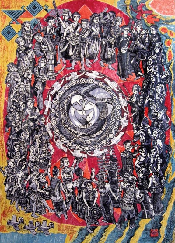 Trong đó, “Vũ điệu mừng xuân” với sắc thái lễ hội tưng bừng của đồng bào Cơ Tu đã góp phần ghi dấu giai đoạn sáng tác sôi nổi đầu thập niên 1990. “Lễ hội Cơ Tu” trên nền lụa lại mang đến cảm giác gần gũi khi gam màu được xử lý tinh tế, gợi ra nhịp điệu quyến rũ của tranh.