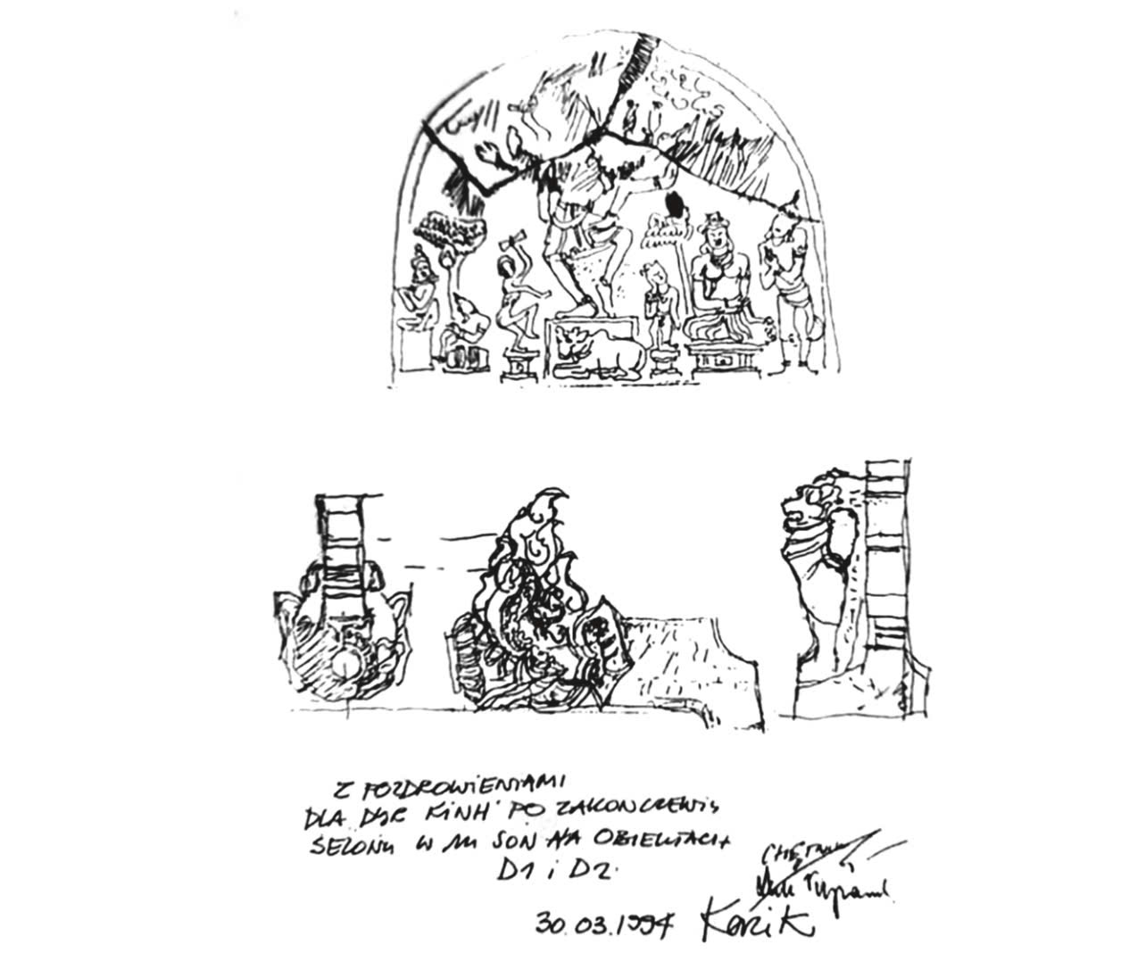 Ở Mỹ Sơn, Kazik làm việc quần quật suốt ngày. Ông chui vào các tháp cổ để khảo sát. Có lần, một chuyên gia khảo cổ nói trong tháp ngày trước có chứa vàng, sau đó người ta lấy mất. Kazik vỗ vỗ vào tường tháp: “Đây mới thật là vàng”. Ông lang thang dọc con suối, nhặt từng viên gạch Chăm, suy nghĩ xem chất kết dính của nó là loại hồ gì, rồi nghĩ ra các phương án trùng tu. Trường phái trùng tu của Kazik là không bao giờ tái hiện như thật những gì đã mất mà chỉ giữ chắc những gì còn lại. Nếu phải dùng các cấu kiện để