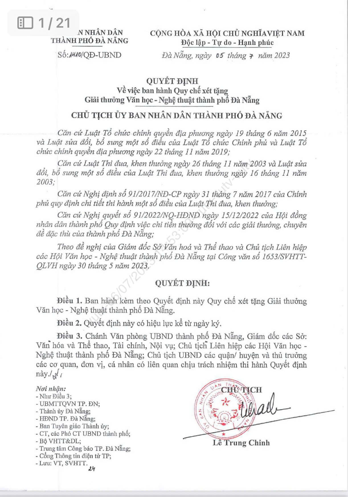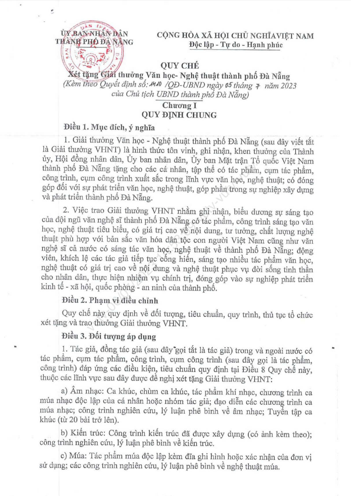Quy chế xét tặng Giải thưởng Văn học - Nghệ thuật thành phố Đà Nẵng