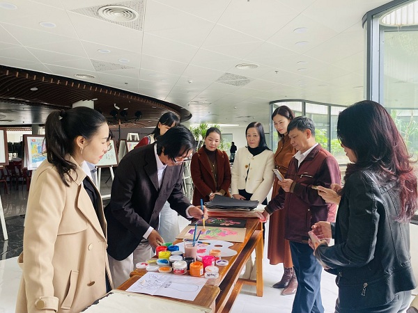 Các họa sĩ và giáo viên đang thực hành kỹ thuật “In dập bản tranh”.