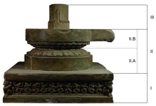 Để dễ theo dõi câu chuyện, xin tạm gọi tên các bộ phận của đài thờ này gồm ba bộ phận (Ảnh 1): (I) dưới cùng là một bệ thờ hình vuông có chạm khắc bốn mặt; (II) trên bệ vuông là 2 thớt đá tròn có chạm khắc hình cánh hoa sen xếp chồng lên nhau, trong đó thớt phía trên (II.B) có vòi dài nhô ra ngoài (như kiểu một máng cối xay bột), cũng được gọi là yoni; (III) một linga đặt ở trung tâm của bệ vuông, xuyên qua hai thớt đá tròn và nhô cao hơn mặt trên của yoni. Ngoài ra có một bộ phận liên quan nằm giữa thớt đá tròn II.A và II.B, không được thể hiện trong ảnh 1, nhưng là một yếu tố dẫn đến nhiều suy luận khác nhau, và đến nay vẫn là một bí ẩn, tạm gọi là bộ phận II.X.