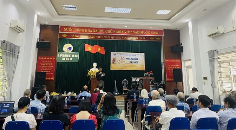 Nhà thơ Nguyễn Nho Khiêm, Chủ tịch Liên hiệp các Hội Văn học - Nghệ thuật thành phố Đà Nẵng phát biểu tại chương trình thơ nhạc “Mưa nguồn hòa âm”.