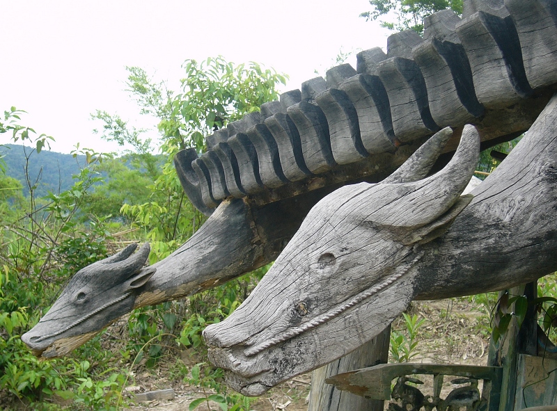 Hình đầu trâu trang trí trên một phía đầu hồi nóc nhà mồ.