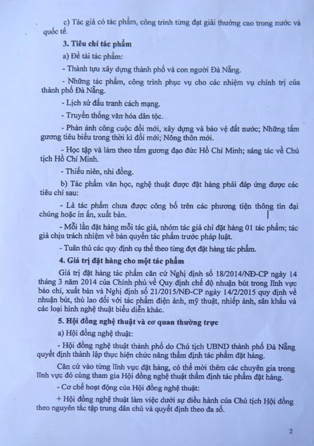 Theo Quyết định số 5772/QĐ - UBND của Chủ tịch UBND thành phố Đà Nẵng vừa ký quy định một số nội dung thực hiện đặt hàng sáng tác tác phẩm văn học - nghệ thuật (VHNT) thành phố, Liên hiệp các Hội Văn học - Nghệ thuật thành phố Đà Nẵng giới thiệu toàn văn Quyết định này.